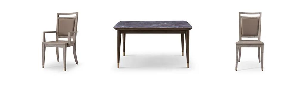 餐桌以简洁干练造型为主,高级百搭的灰色调,软包真皮,金属镶嵌的细节,打造出悠闲奢华、优雅精致的风格,让家的味道从一日三餐中抵达内心深处。